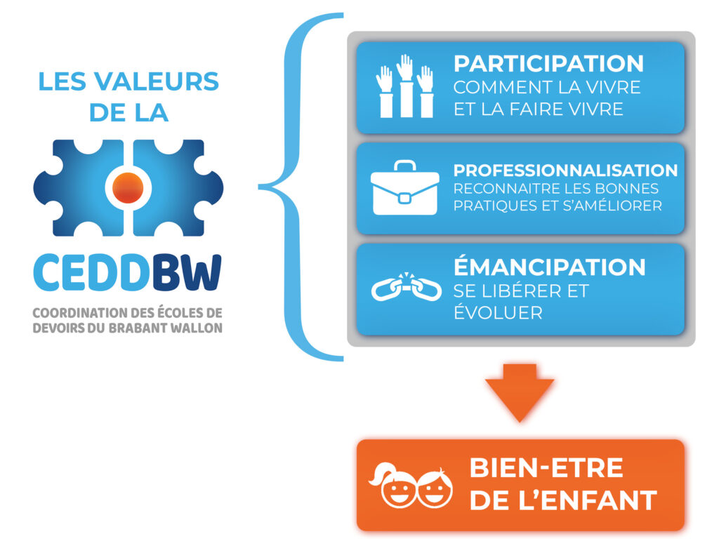Le bien-être de l’enfant, notion première pour l’ONE, est réaffirmé comme la valeur centrale du secteur Ecole de Devoirs dans sa globalité (EDD + opérateurs culturels), c’est donc celle qui doit guider l’ensemble de nos actions.